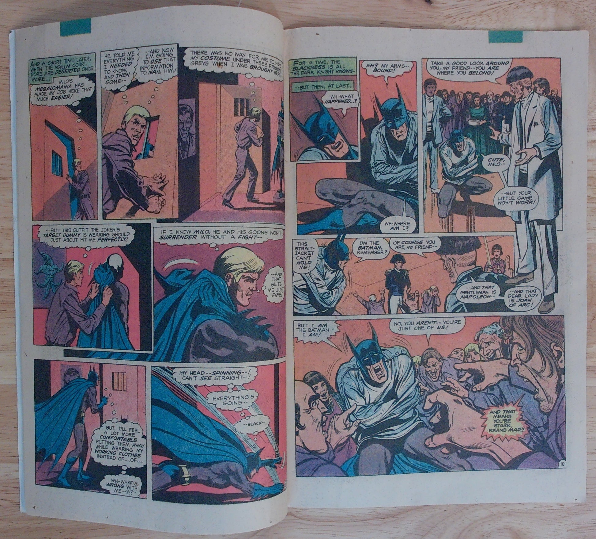 The ploy almost works until Batman notices in a mirror that his pupils are dilated, and deduces that he is still drugged. Batman takes out two of Milo's guards even while bound, convinces "Joan of Arc", another inmate, to cut him free, and goes after Milo. The villain emerges from his office in a protective suit and helmet, and smashes a vial of insanity-producing gas. Batman backs off, but the other inmates have followed Batman as their leader and surround Milo, before beating him, breaking his helmet. When the gas dissipates, Batman finds that Milo is a victim of his own formula, now hopelessly insane.